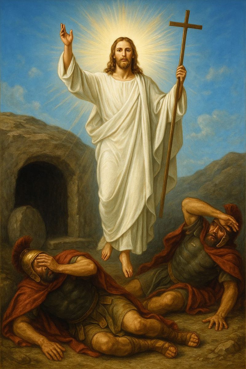 У темному кам’яному гробі лежить мертве Ісусове тіло, загорнуте в плащаницю. На третій день після Ісусової смерті Його Дух входить до мертвого тіла. Господь воскресає з мертвих! Настає не лише воскресіння, але й перемінення Його тіла. Ісус воскресив Лазаря й інших людей, але вони знову померли. Однак тут йдеться про інший рівень воскресіння. Слово Боже каже, що Христос воскрес як перший з тих, які померли (див. 1 Кор. 15,20). Він прийняв на Себе кару за наші гріхи – смерть, але також воскрес – перший з тих, які померли. Усвідоммо силу Божої всемогутності в цьому акті, який одночасно має відношення і до нас.