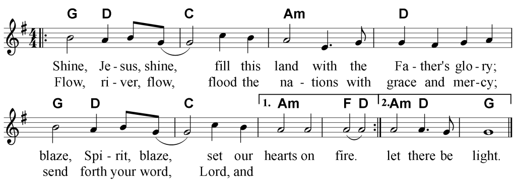 Now I give thanks that the mountain of demons was lifted up and thrown into the fiery sea by the power of God. We sing a solemn tune “The mountain’s lifted high!” At the end we sing three times triumphantly: “Shine, Jesus, shine”.