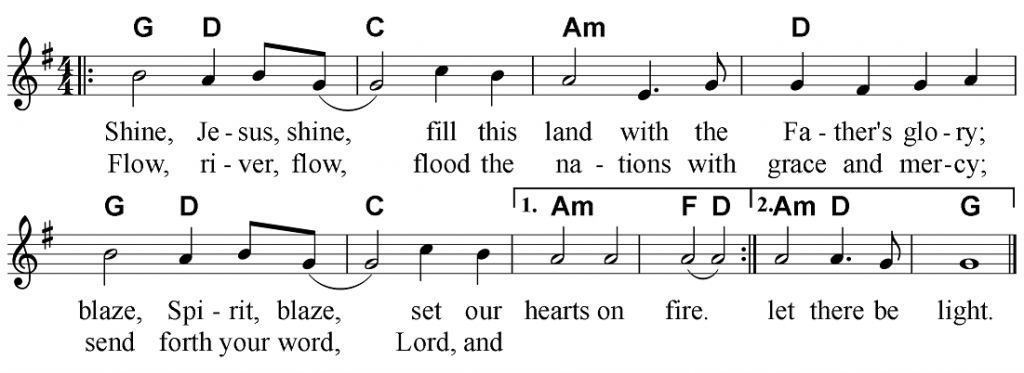 Now I give thanks that the mountain of demons was lifted up and thrown into the fiery sea by the power of God. We sing a solemn tune without words: “La, la, la, la” – e.g. the tune of the song “Glory! Glory! Hallelujah!” At the end we sing three times triumphantly: “Shine, Jesus, Shine”.