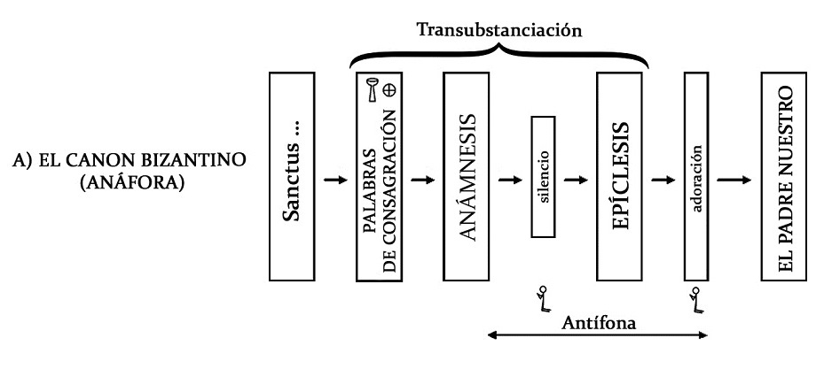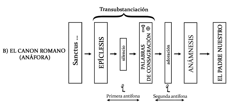 (Nota: epíclesis = la invocación del Espíritu Santo; anámnesis = recuerdo de la muerte, resurrección …; antífona = canto; palabras de la consagración: «Esto es mi Cuerpo … mi Sangre …»; consagración = la transformación de los dones; adoración = profunda adoración y unión con Jesús crucificado)