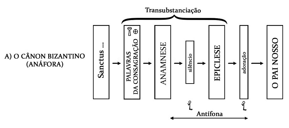 A) Liturgia oriental: O sacerdote recita ou canta as palavras da instituição. Depois das palavras da instituição, vem a anamnese que o sacerdote reza em silêncio ou em voz alta, recordando o que sucedeu por nós: “A cruz, a morte, o sepulcro, a ressurreição…”.
