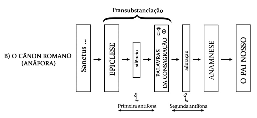 B) Liturgia ocidental: Depois do Sanctus, o sacerdote recita o cânon (anáfora). O primeiro cânon só assume implicitamente a epiclese: “… de modo que (esta oferta) se converta para nós (pelo poder do Espírito Santo) no Corpo e †no Sangue de Teu Filho amado, Jesus Cristo, nosso Senhor”.