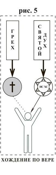 Если ветхий человек не находится на кресте, то во мне не может жить Христос (рис. 4). Но если ветхий человек в конкретной ситуации находится на кресте и в смерти с Христом (рис. 5), то грех не действует на тело, и тогда через Святого Духа «живет во мне Христос» (Гал. 2,20). Это значит ходить в Духе, жить жизнью победы, жизнью свободы! Нам нужно этому учиться и переживать это, прежде всего, во внутренней молитве. Иисус говорит: «Так ли не могли вы один час (ежедневно) бодрствовать со Мною?» (Мф. 26,40).